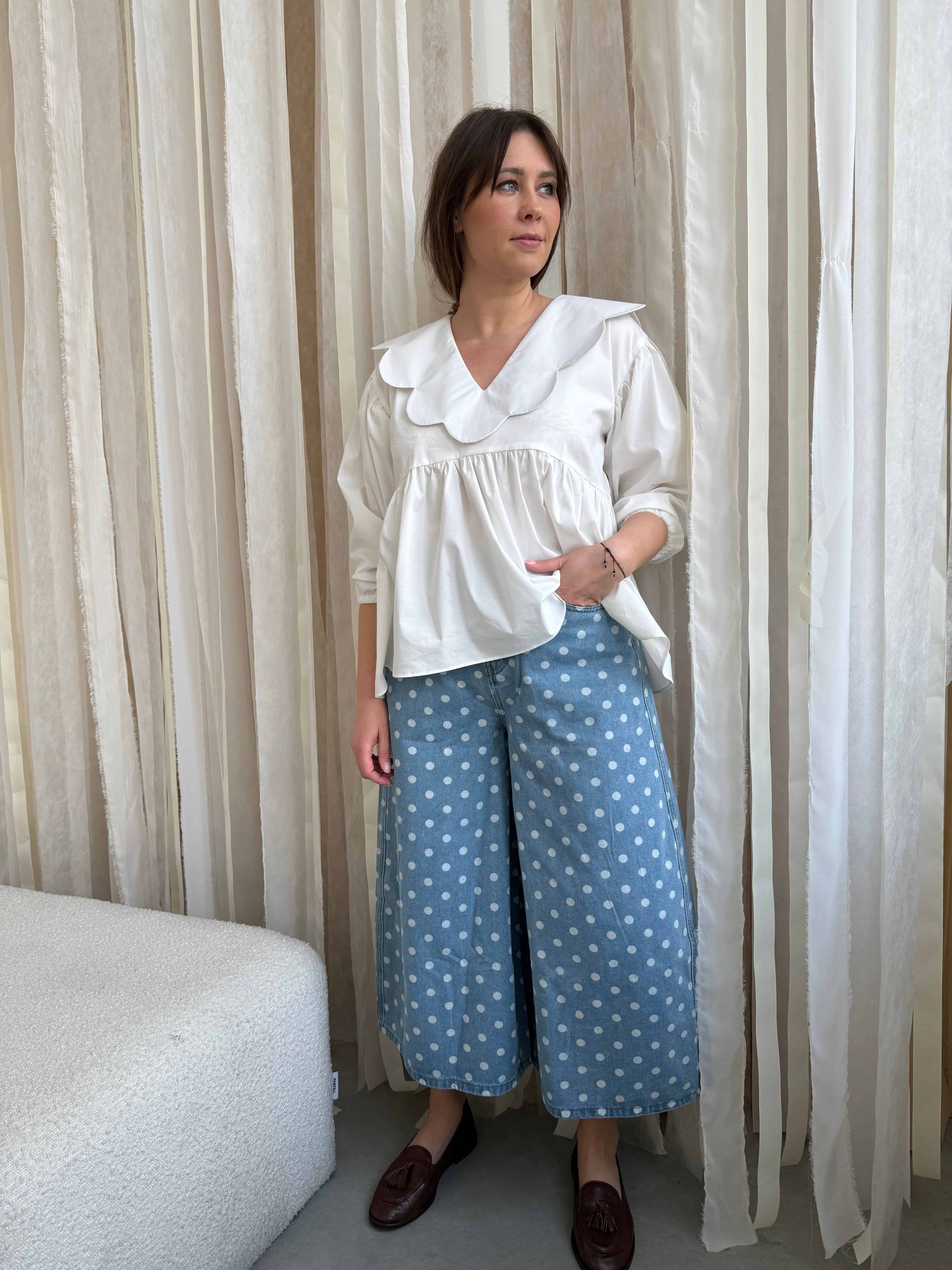 Jeansy Dot to nowa, wiosenna propozycja z kolekcji Perełki Malwiny. Model o szerokiej nogawce typu kuloty, zakończonej nad kostką, pięknie układa się w ruchu i nadaje sylwetce lekkości.