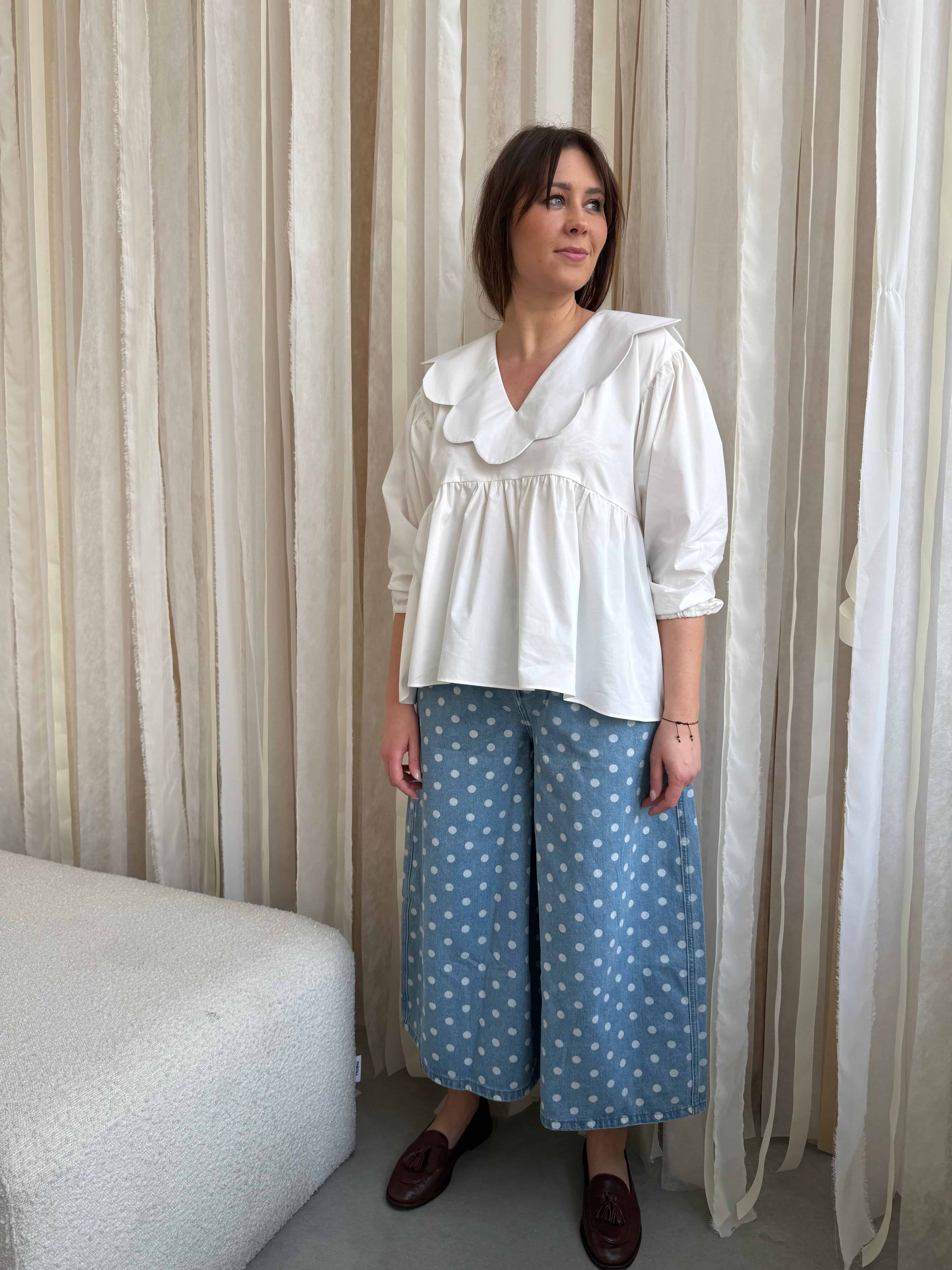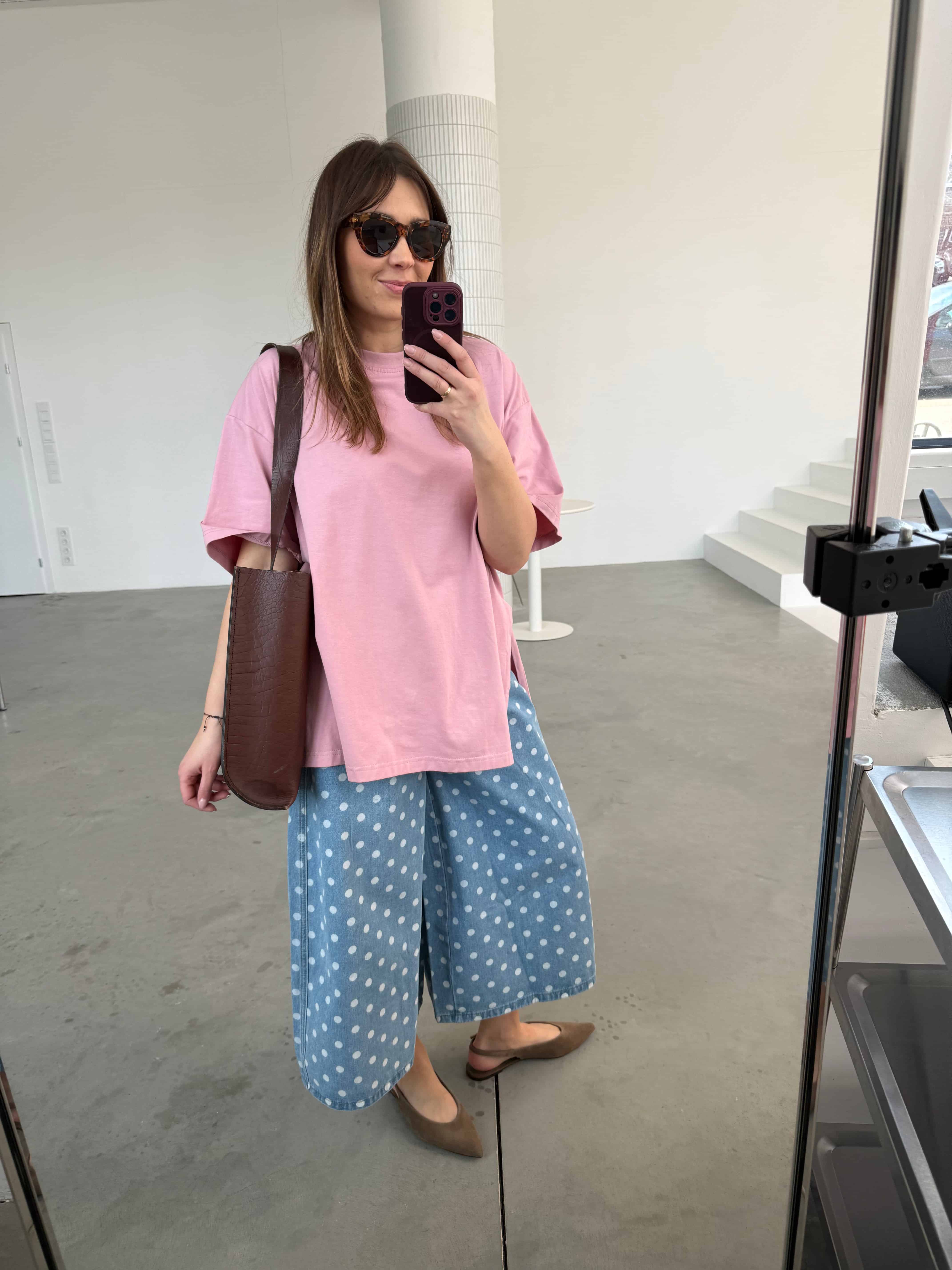 Najbardziej przyciąga wzrok detal — subtelny wzór w groszki. Jeden z najmocniejszych trendów tego sezonu, w wydaniu, które pozostaje kobiece i wyważone. Dzięki niemu nawet najprostsza stylizacja zyskuje wyraz i świeżość.